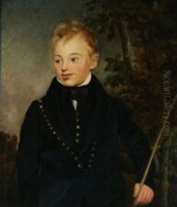 Portrait Of Henry Greswold Lewis , Half-length, In Abrown Fur-lined Coat, A Draped Red Curtain And Landscape