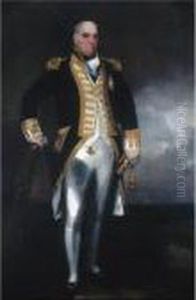 Portrait Of Henry Greswold Lewis In A Brown Fur-lined Coat, A Draped Red Curtain And Landscape Beyond