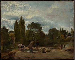 Anglers And Farm Workers Beside A Pool In An Extensive Landscape