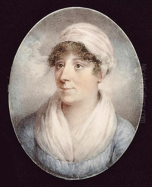A Lady, Wearing Blue Dress, White Fichu And Turban In Her Hair