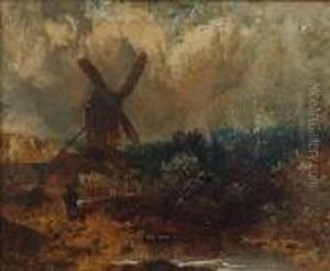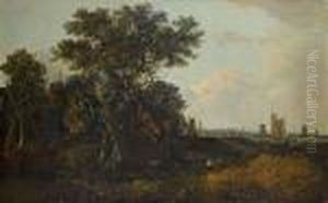 A Wooded Landscape With Cottages By A River And A Windmillbeyond
