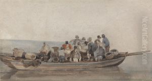 Moonlit River Landscape With Figures In A Boat By Cottage