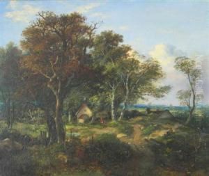 Wooded Landscape With Figures By A Cottage And An Old Oak Tree