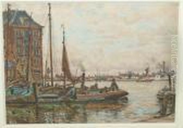 "on The Maas, Holland", Dutch Harbour Scene With Barges And Other Boats By A Quayside Signed