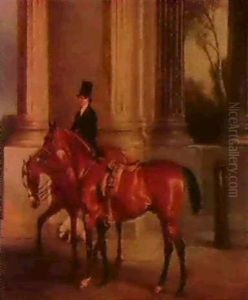 Mr. Charlton And His Groom Holding A Chestnut Hunter In A Yard