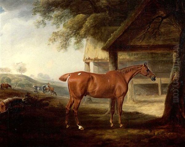 Lord Herbert's Favorite Hunter "corthorn" By A Stable, A Landscape With Other Horses Beyond