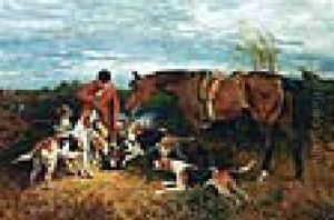 A Huntsman On Horseback With Foxhounds Greeting A Hedger In A Landscape
