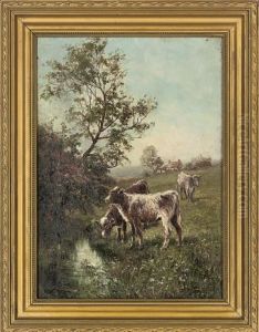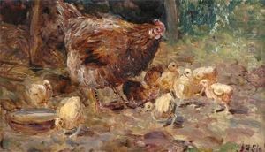 An Impressionistic Farmyard Scene With A Cart By A Pool Andchickens And A Calf Nearby