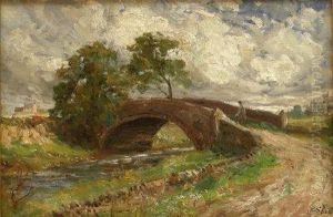 A Figure On A River Bank, Cottages And A Bridge Beyond
