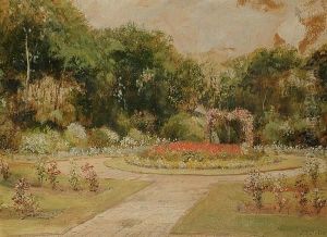 A Garden And Ornamental Pond In Summer - Oil Pastel