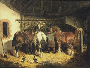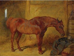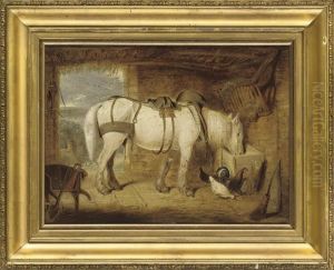 A Chestnut Cob, A Grey Cob And A Goat In Astable Interior
