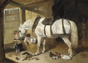 Horse And Donkey And Ducks In A Stable; Oil On Canvas