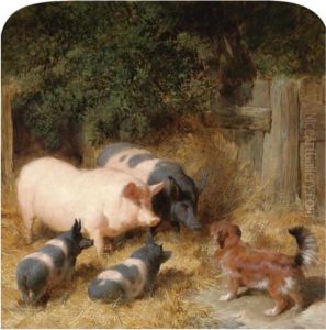 Shire Horses, Pigs And Other Livestock By A Stable With A Cottage And Church Beyond