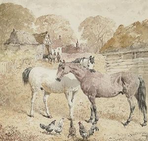 Horses, Cattle, Pigs And Chickens In A Byre With A Hunt Beyond; And Horses And Chickens By A Farmyard Pond