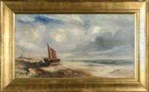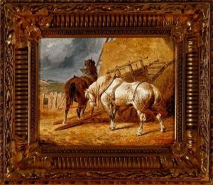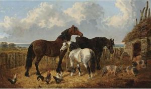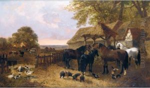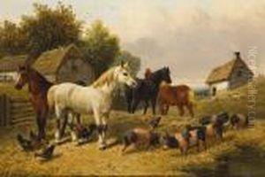 Draught Horses And A Cart, With Figures, Pigs And A Goat In A Farmyard, Cows In A Pasture Beyond