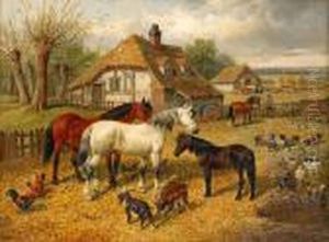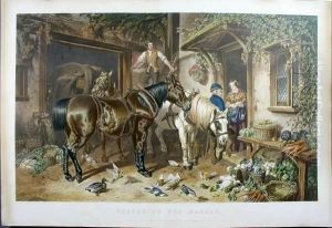 Stable Scene With Farm Horses Feeding, Ducks And Pigs