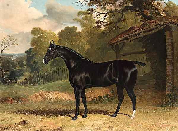 Black Tom, a black hunter, beside a stable, in a wooded river landscape