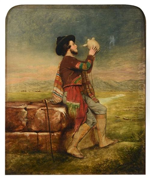 Spanish Shepherd Resting On A Wall, Drinking From A Jug
