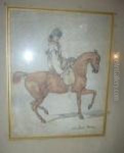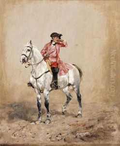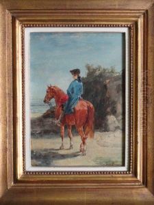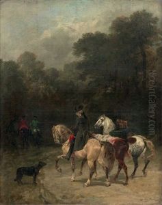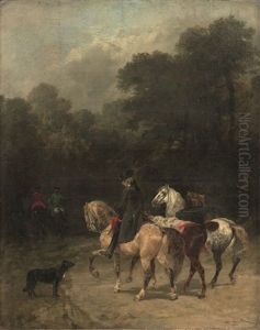 Chasse A Courre A L'oree Du Bois, Trois Chasseurs Et Une Amazone Suivis Du Piqueur Et Des Chiens.