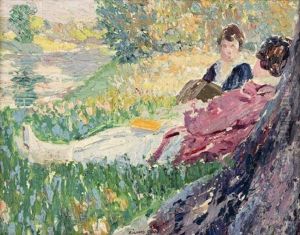 'resting Time'; Figures Beside A Tree In Awooded Landscape
