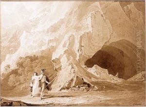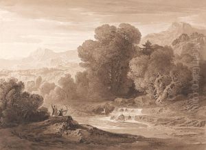 Mountainous Landscape with Figures and a Rock Above a Lake