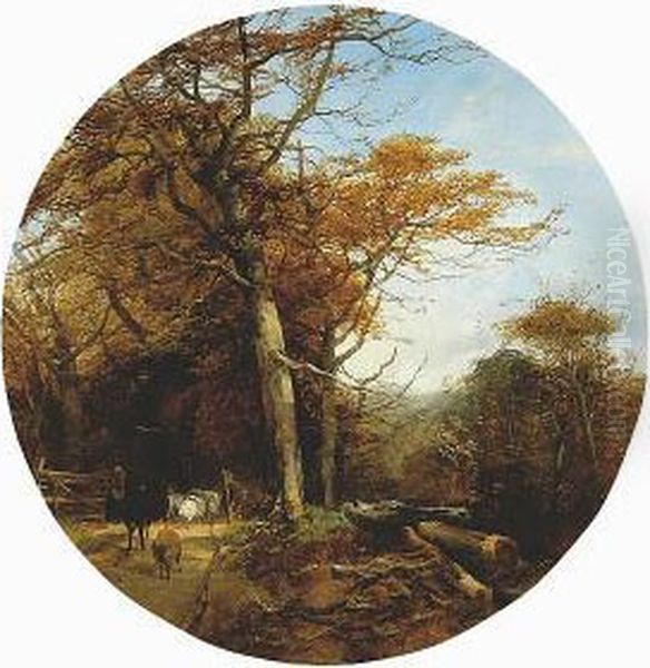 Sheep And A Cow With A Drover On A Woodland Path