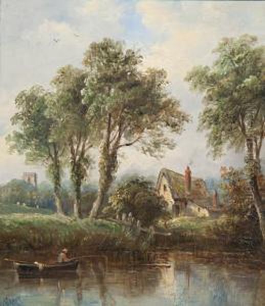 A Woman Fetching Water From A Stream Before A Thatched Cottage