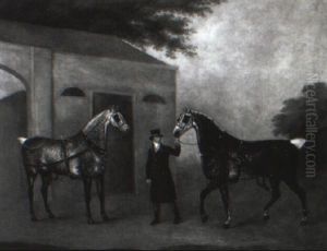 A Groom With Chestnut And Bay Hunters And A Spaniel Beside A Stable, A River And An Extensive Landscape Beyond