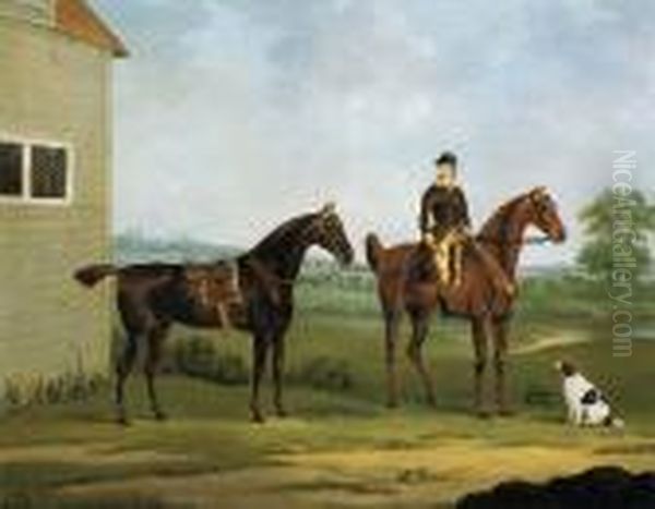 A Chestnut And A Bay Hunter With A Groom And Spaniel