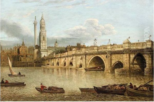 A View Of Old London Bridge Looking Towards Monumentand The Church Of St Magnus