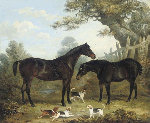 Two Chestnut Hunters, With Puppies Playing In The Foreground