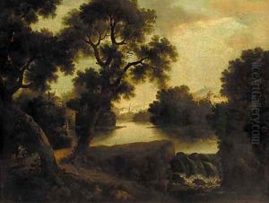 Mountainous River Landscape With Figures In A Boat Setting Off From The Shore