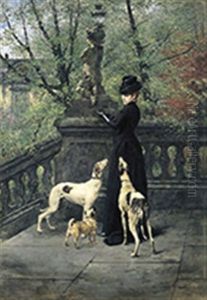 Portrait Of Miss S.d. Chambers, Full-length, In A White Dress, Seated With A Dog, In A River Landscape