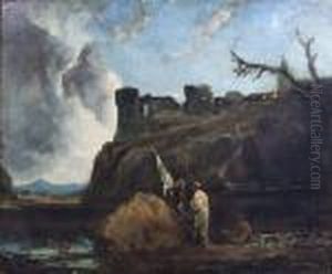 Cattle Watering By Llanberis Lake From Dolbadarn Castle, Withsnowdon Beyond, North Wales