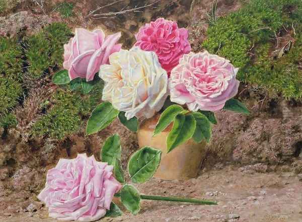Roses in an Earthenware Vase by a Mossy Bank