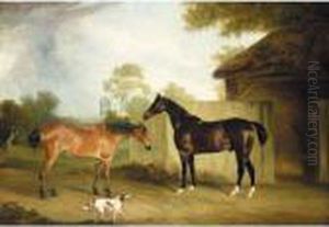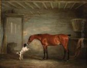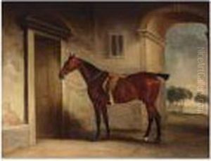 Sir John Thorold's Bay Hunters With Their Groom In A Stable