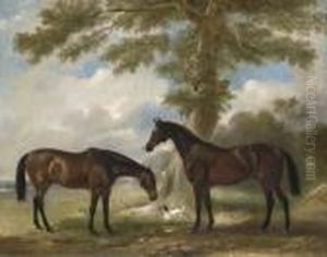 Two Bay Mares With A Terrier By A Tree, In A Landscape