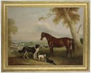 A Chestnut Hunter And Three Dogs Belonging To William Brewitt In A Landscape With A Steam Train And Two Churches In The Distance