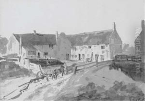 An Old Fisherman Repairing Nets with a Cottage in the Background