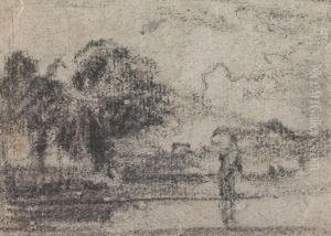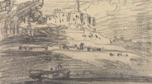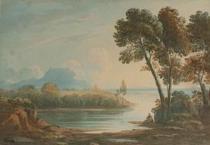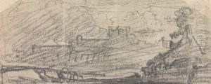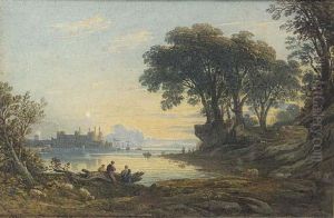 A Shepherd By A River At Dusk With A Castle And Mountains Beyond