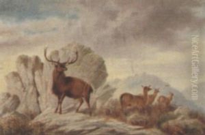 Stags Before A Loch In A Highland Landscape