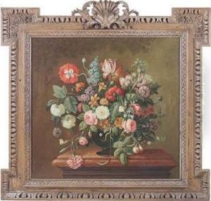 Still Life Of Roses And Other Flowers In Aclassical Urn, Before A Vista