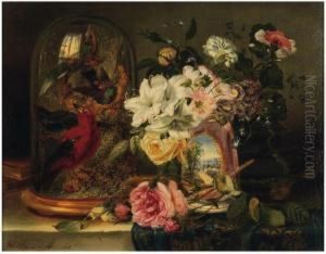 A Still Life with Roses in a Vase beside Exotic Birds in a Glass Case, 1863