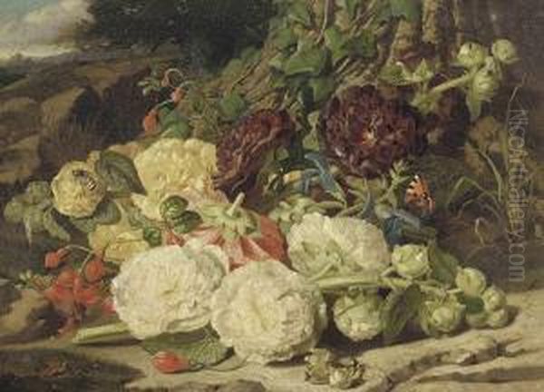 Peonies, Fuschias And Ivy On A Sandy Bank