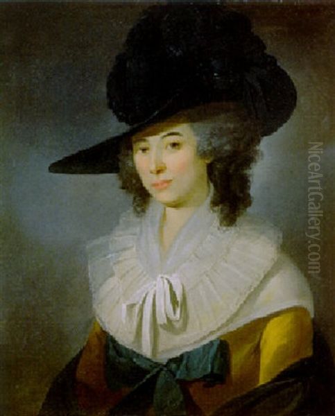 Portrait Of Mrs William Bligh, In A Yellow Dress With A Blue Bow And Lace Collar, A Blue Hat And Shawl Oil Painting - John Webber