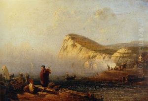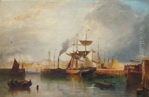 A View Of Harbor, Hartlepool, Scotland, With A Dutch Sailingboat Off A Quay, A Fishing Fleet And A Lighthouse Beyond