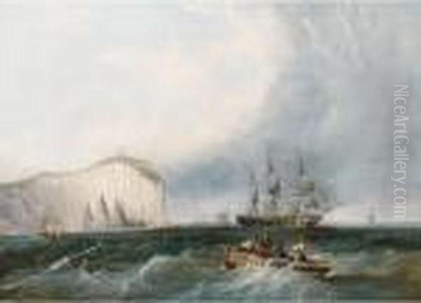 A Frigate Weaving Through Small Craft Off A Lofty Headland