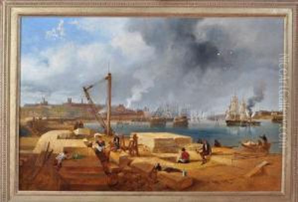 A Panoramic View Of The Wear At Sunderland With Stonemasons At Work On The South Pier