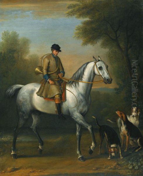 A Huntsman On A Grey Hunter With Hounds In A Landscape