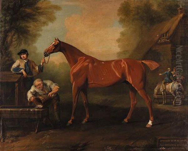 Greville, A Chestnut Thoroughbred Held By A Groom, With Otherfigures By A Barn